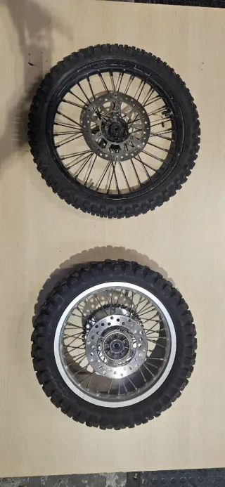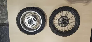 Llantas para moto Yamaha Iz 85cc. - Llanta delantera con disco de freno. - Llanta trasera con piñón.