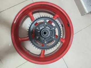 Llanta de moto Triumph de color rojo, lista para instalar. - Llanta de aleación. - Incluye corona trasera.