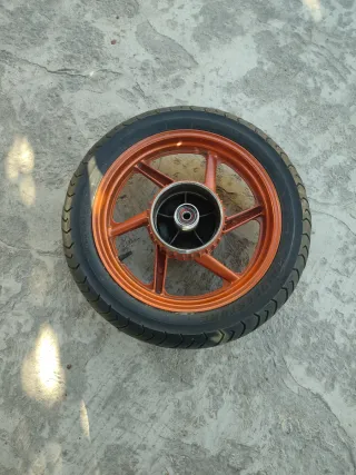 Llanta de moto usada en buen estado. Ideal para reparar o restaurar tu moto. - Llanta de aluminio. - Disco de freno incluido. - Presenta algunas marcas de uso.