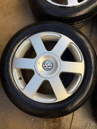 Juego de 4 llantas originales de Volkswagen con neumaticos, Diseño de 5 radios plateados. 1 neumatico pinchado Medidas 5x112 205/55/16 - Llantas de aleación. - Logo de Volkswagen en el centro. - Compatibles con varios modelos VW. Validas para mas modelos como seat, audi, skoka,
