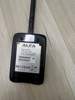 Adaptador WiFi USB Alfa Network AWUS036NHA, chipset Atheros AR9271. 802.11 b/g/n (2.4 GHz), largo alcance, antena externa. Compatible con Linux, soporta modo monitor e inyeccion. En perfecto funcionamiento.