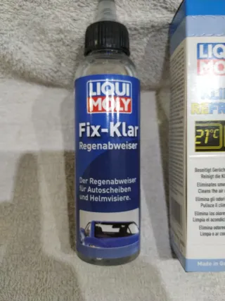 Pack de dos productos de LIQUI MOLY: Fix-Klar y Klima Refresh. NUEVO SIN USAR - Fix-Klar: Regenabweiser para parabrisas y viseras de casco. - Klima Refresh: Elimina olores y limpia el sistema de aire acondicionado del vehículo.