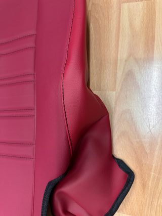 Fundas de asiento hechas a medida para Seat 600 D. Están fabricadas en polipiel negra con costuras rojas. - Material: Polipiel. - Color: Negro con costuras rojas. - Diseño: A medida para Seat 600 D.