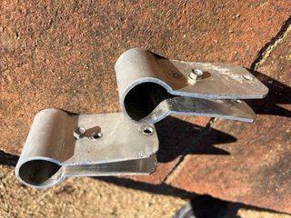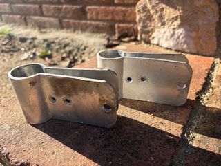 Conjunto de soportes metálicos para motos. Están fabricados en metal y presentan un diseño perforado. - Material: Metal - Diseño: Perforado