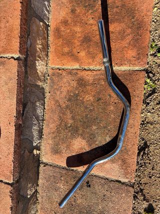 Manillar cromado para Bultaco Campera o Metralla. Pieza de metal pulido con un diseño curvo característico. - Material: Metal cromado. - Diseño: Curvo.