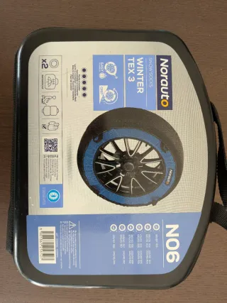 Cadenas de nieve textiles Norauto Winter Tex 3, talla NO6. El paquete está sin abrir y las cadenas sin usar. - Incluye 2 unidades (x2). - Resistentes al agua (Waterproof). - Fácil de instalar y quitar. - Diseñadas para un buen agarre (Grip). - Compatibles con varios tamaños de neumático, incluyendo 185/80 R13, 195/70 R14, 205/60 R15, 215/45 R17, 225/40 R18, entre otros.