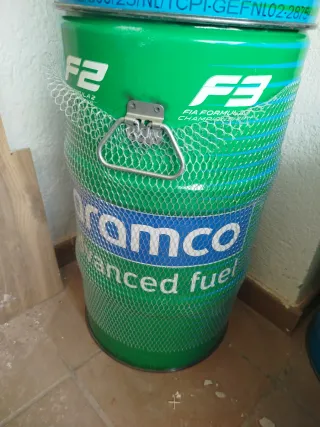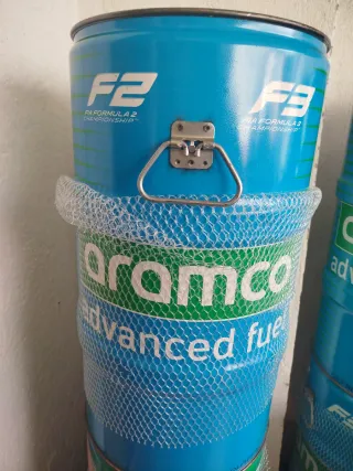 Bidón vacío de F2 y F3, ideal para decoración. - Diseño con logos de Fórmula 2 y Fórmula 3. - Marca Aramco Advanced Fuel. - Incluye asa metálica.