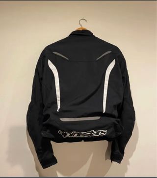 Chaqueta de moto Alpinestars en talla M. Diseño deportivo y funcional. - Color negro con detalles blancos y grises. - Logo de Alpinestars en pecho y mangas. - Inscripción 'Alpinestars' en la manga izquierda.