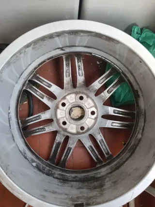 Juego de llantas de aleación para Audi. - Diseño deportivo de 5 radios dobles. - Acabado plateado. - Logo de Audi en el centro. - Una de ellas necesita reparación
