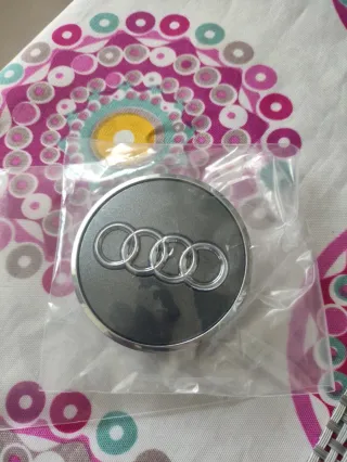 Emblema circular con el logo de Audi. - Diseño de cuatro aros entrelazados. - Acabado metálico plateado.