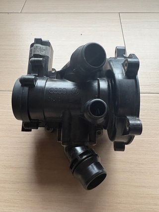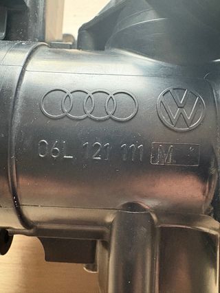 Cuerpo de termostato para bomba de agua de Golf GTI 7. - Ref. 06L 121 111 M Tambien entrego la bomba de agua solo hay que cambiar juntas,son baratas en la casa VW. - Fabricado en plástico negro. - Incluye conexiones para mangueras. - Logos de Audi y Volkswagen visibles.