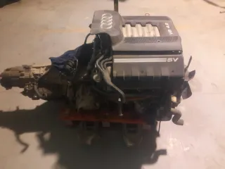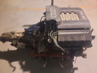 Motor V8 4.2 de Audi S8 del año 2000. - Motor completo con transmisión. - Insignia V8 4.2 visible en la tapa. - Logo de Audi en la tapa del motor.