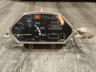 Marcador para Derbi Variant, modelo World Champion. Cuadro cuenta kilómetros en perfecto estado. - Indicador de combustible. - Indicador de intermitentes. - Indicador de luces. - Velocímetro en Km/h y MPH. - Odómetro con lectura de 100004. - Logo de FACOMSA.