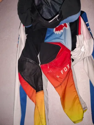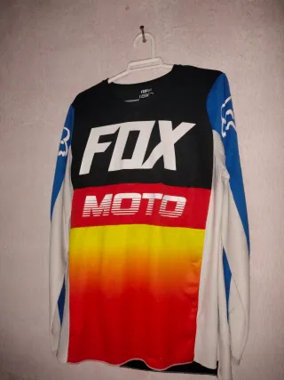Camiseta talla M de manga larga para enduro con un diseño llamativo. - Diseño frontal con logo FOX MOTO. - Mangas de color azul y blanco con detalles. - Degradado de colores en la parte inferior.