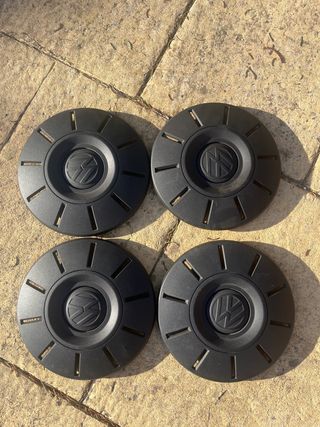 Juego de 4 tapacubos negros para Volkswagen Crafter. Diseño moderno y funcional. - Acabado en color negro mate. - Logo de Volkswagen integrado en el centro. - Fabricados en plástico resistente.