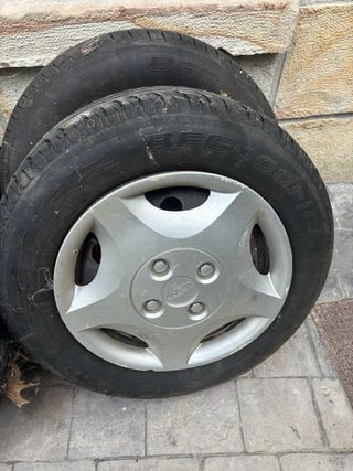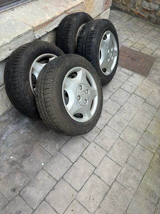 Juego de llantas para Ford Focus MK1. Las llantas son de 14 con 3 neumaticos a medio uso y uno nuevo, aunque viejo. - Incluye tapacubos con logo Ford