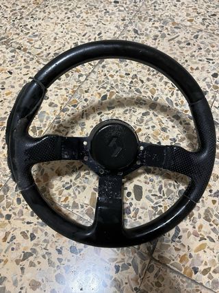 Volante deportivo de tres radios en color negro. - Diseño perforado en los brazos para mejor agarre. - Cubierta de goma en el aro. - Logo central.