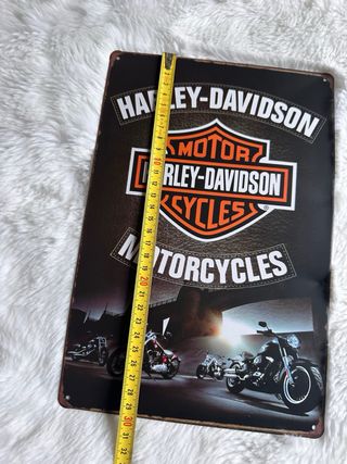Placa decorativa de metal con el icónico logo de Harley-Davidson. - Diseño clásico de la marca. - Imagen de motocicletas Harley-Davidson. - Ideal para coleccionistas o amantes de las motos.