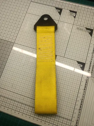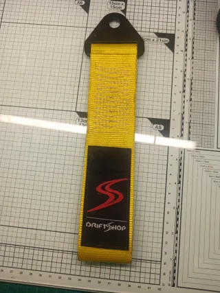 Correa de remolque de la marca Driftshop en color amarillo. - Correa de tela resistente. - Soporte de montaje metálico. - Etiqueta con logo de Driftshop.