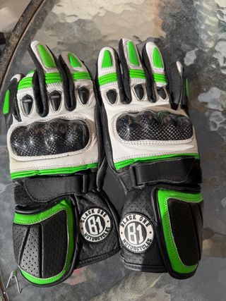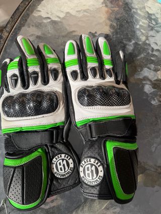 Guantes de moto de cuero con protecciones. - Color blanco, negro y verde. - Protecciones en nudillos y palma. - Cierre de velcro en muñeca. - Logo Black One Motorcycles en la muñeca. Puestos en dos ocasiones
