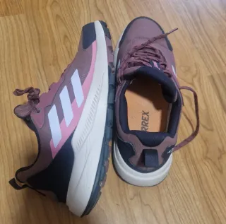 Zapatillas de montaña Adidas Terrex, ideales para senderismo y actividades al aire libre. Están nuevas, sin usar. - Color: Morado/Burdeos - Suela con buen agarre - Diseño ligero y resistente - Logo de Adidas Terrex en la plantilla y lengüeta