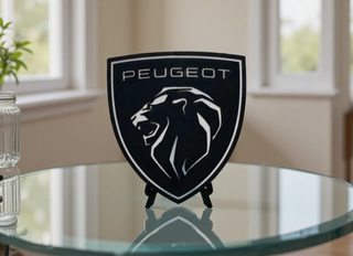 Logo de Peugeot, fabricado con impresión 3D en material PLA, con soporte incluido.