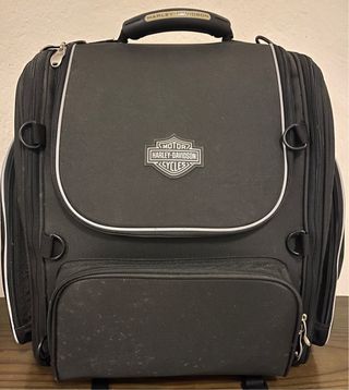 Conjunto de dos maletas de viaje para motocicleta Harley-Davidson. En perfecto estado. Muy poco uso - Maleta superior con logo Harley-Davidson. - Maleta inferior con logo Harley-Davidson. - Color negro con ribetes plateados. - Fundas para la lluvia en ambas maletas - Muy espaciosas