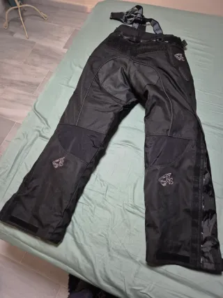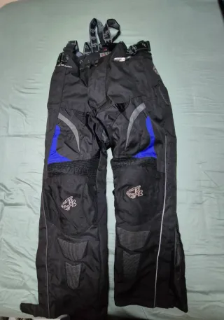 Traje de moto completo con tirantes ajustables. Diseñado para ofrecer comodidad y protección. - Tejido negro resistente. - Detalles en azul y gris. - Cremalleras laterales en las piernas. - Logos de la marca en los muslos. - Paneles acolchados en las rodillas, espalda, codos y caderas. Se adapta a modo verano/invierno. Podría usarlo para esquiar también.