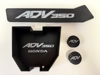 Conjunto de baúl porta objetos para depósito, tapones para el manillar y tapa de herramientas para Honda ADV 350. - Incluye piezas con acabado en carbono y logo. - Cajetín de plástico negro y gris con logo ADV 350 y Honda. - Tapa de plástico negro con logo ADV 350 en efecto carbono. - Dos tapones para el manillar con logo ADV y acabado carbono. - Se pueden hacer en otros colores o personalizados, más modelos en mi perfil