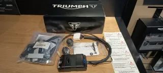 Kit de alarma para motocicleta Triumph. - Modelo: A9808110 - Incluye centralita, cableado y accesorios. - Logo de Triumph visible en la centralita y en la bolsa.