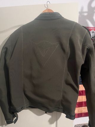 Chaqueta de moto con un diseño moderno y detalles de cuero. - Color verde militar. - Cuello de cuero. - Cierre de cremallera frontal. - Logo Dainese en el hombro.