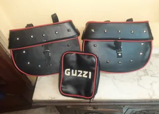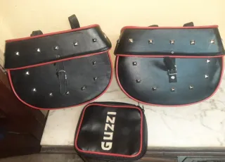 Set de dos alforjas negras para moto Guzzi 65, con ribete rojo y tachuelas decorativas. - Material: cuero sintético. - Diseño: estilo clásico con cierre de correa y hebilla. - Incluye una pequeña bolsa adicional con cremallera y el logo Guzzi.