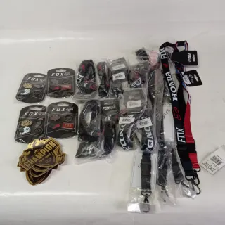Lote variado de accesorios de la marca Fox para motociclismo. Incluye pines y cintas. Pins - 4 paquetes con 4 pins cada uno Cintas - 13 - Pines con diseños de la marca Fox. - Cintas con el logo de Fox y Honda.