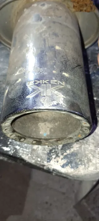 Escape Remus con logo grabado. En inoxidable perfecto para adaptar en tu coche , escape sucio se puede pulir y dejar nuevo si desea y aque es acero inoxidable - Diseño cromado. - Borde con perforaciones.