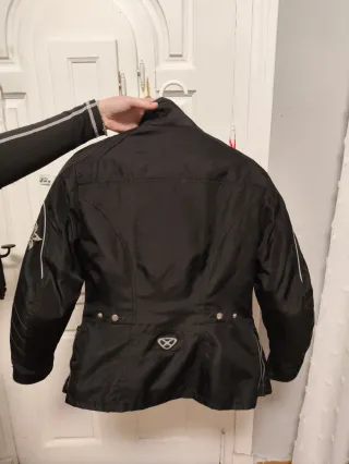 Chaqueta de moto negra con detalles plateados. - Cuello alto. - Cremalleras en los puños. - Diseño con líneas plateadas en mangas y espalda. - Logo plateado en la parte baja de la espalda. Con protrecciones
