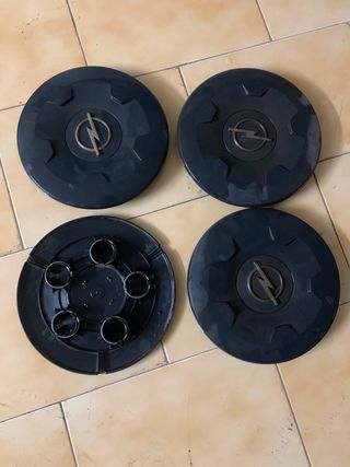 Set de cuatro tapas de rueda para Opel. Presentan un diseño circular con el logo de la marca en el centro. - Color negro. - Logo Opel plateado.