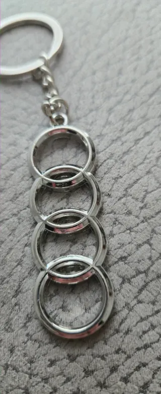 Llavero con diseño de cuatro anillas entrelazadas, inspirado en la marca Audi. - Material metálico plateado. - Diseño elegante y moderno.