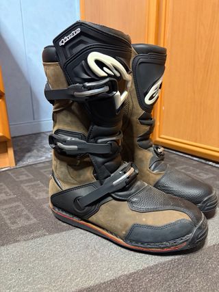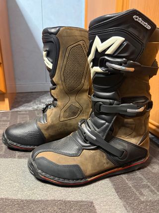 Botas de trial Alpinestars Tech T en color marrón y negro. 300€ aproximadamente valen nuevas en motocard o similares Una hora de uso para ver si me hacia a ellas , vendi la moto y eso fue lo que se usaron , pueden verse las suelas al detalle,no tienen ni una marca de estribera o piedras o desgaste alguno Practicamente las estrenas tu,la plantilla esta intacta,se puede ver el logo de la marca y la etiqueta impresa en el interior,las botas están nuevas - Diseño robusto y protector. - Cierre con hebillas. - Materiales de alta calidad.