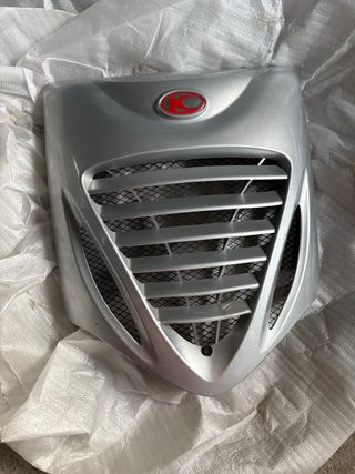 Tapa frontal plateada para Kymco Bet & Win 250. Presenta un diseño con rejilla y el logo de la marca en rojo. - Color: Plateado - Logo: Kymco en rojo - Diseño: Rejilla frontal