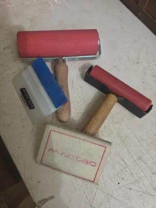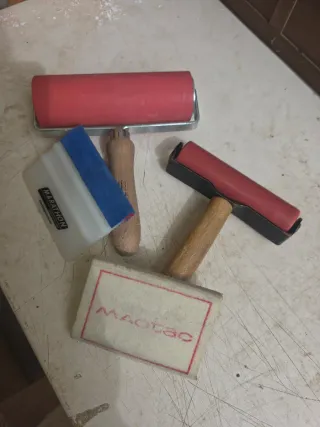 Se venden conjunto de herramientas de Rotulación", "Vinilo", "Wrapping", "Rodillos de presión". Rodillo de goma rojo grande. Rodillo de goma rojo pequeño con marco negro. Rasqueta blanca con borde azul (MARATHON). Cepillo con marco rojo y logo MAC TAC.