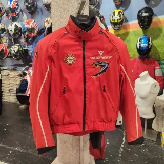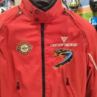 Chaqueta Dainese de la colección Max Biaggi talla 48/M con protecciones en codos hombros antebrazos y forro interior desmontable al igual que las mangas. - Talla M. - Diseño deportivo en color rojo. - Logo de Dainese y gráfico de pantera. - Cierre de cremallera frontal.