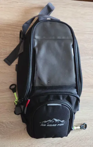 Bolsa para depósito de moto de la marca AM ROAD FOX. Diseñada para ser práctica y funcional. - Color negro. - Compartimento transparente superior. - Cremalleras resistentes. - Logo de AM ROAD FOX con montañas.