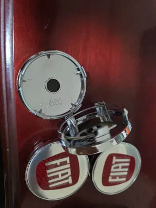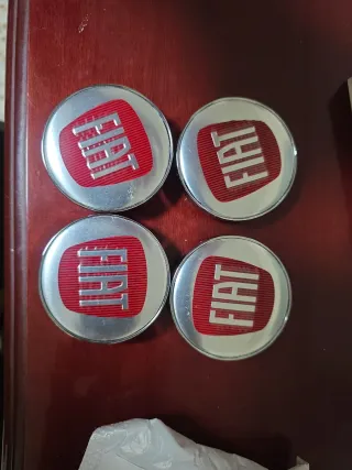Set de 4 tapacubos con el logo de Fiat. - Diseño clásico con fondo rojo y letras Fiat plateadas. - Ideales para personalizar o reemplazar tapacubos de vehículos Fiat.
