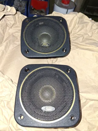 Pareja de altavoces para coche Ford clásicos. Presentan un diseño cuadrado con rejilla protectora y un aro dorado. - Logo de Ford en la rejilla. - Montaje de 4 tornillos.