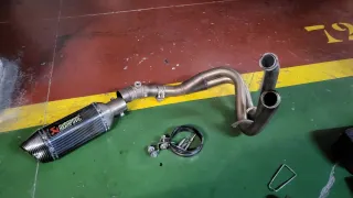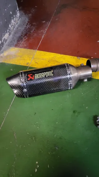 Sistema de escape Akrapovič con acabado en carbono para Kawasaki Z650. Diseñado para mejorar el rendimiento y la estética de tu moto. - Material: Fibra de carbono y acero inoxidable. - Logo Akrapovič visible.