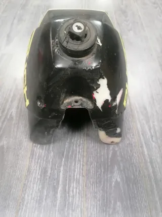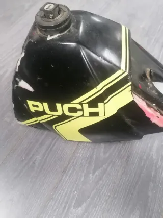 Depósito de combustible para Puch Cóndor. Color negro con detalles amarillos. - Logo de la marca Puch visible. - Diseño con líneas amarillas.
