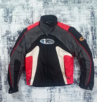 Chaqueta de moto AXO en colores negro y rojo. Diseño deportivo y moderno. - Cierre frontal con cremallera. - Cuello alto. - Detalles en color gris y beige. - Logo ovalado en el pecho. - Bolsillos laterales. - Talla L, pero se ajusta a una M - Protección en hombros y codos.