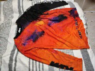 Camiseta de manga larga para motocross o enduro, original de la marca KTM. Presenta un diseño vibrante con tonos naranjas, negros y detalles morados, evocando un atardecer o paisaje abstracto. - Diseño con degradado de color. - Estampado gráfico llamativo. - Logo de la marca visible.