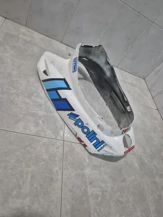 Bañera válido para Yamaha Jog r antigua,Yamaha artistic y Big jog. Presenta el logo de Polini. - Color blanco con detalles en azul. - Diseño deportivo. -Donde el depósito tiene un par de grapas porque tiene una grieta,lo cual ya no se mueve.
