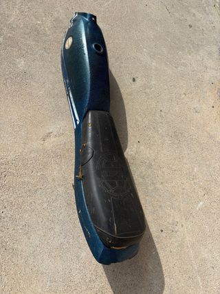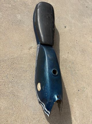 Conjunto de depósito y asiento para Derbi Coyote. Es usado, pintura original, el asiento está roto, se puede tapizar. - Depósito de color azul metalizado. - Asiento negro con logo. - Piezas de segunda mano. Telf.- 610210921